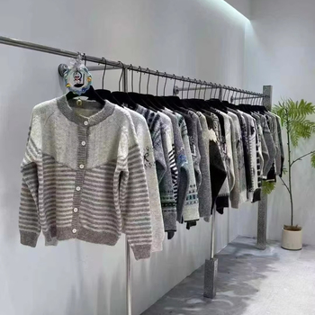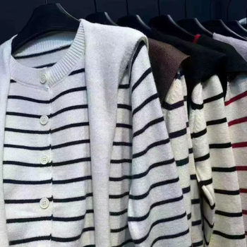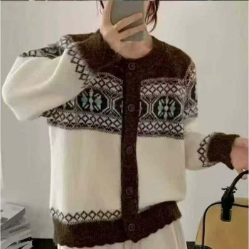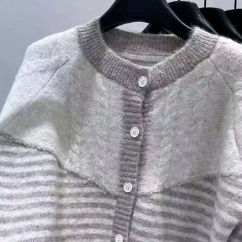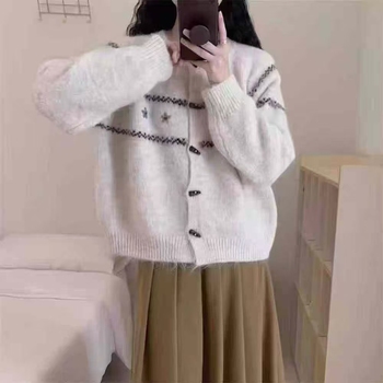 เสื้อโค้ทถักขนแกะแนววินเทจของผู้หญิงเสื้อคาร์ดิแกนคอกลมแขนยาวเสื้อสเวตเตอร์ถักทรงแบนถักฤดูใบไม้ร่วงฤดูหนาว